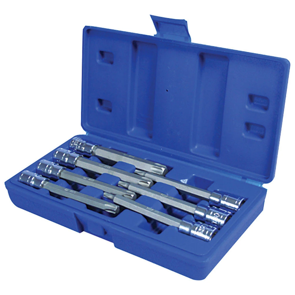 An excellent set of extra-long Torx bit sockets mounted on a 3/8” socket. Manufactured from Chrome vanadium for strength and longevity. The length makes working where space is tight easier, making this set ideal for automotive use. Supplied in a hard plastic case.