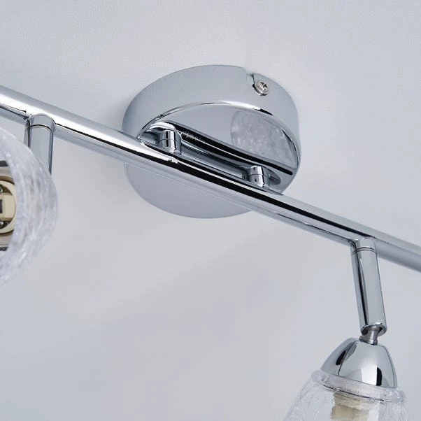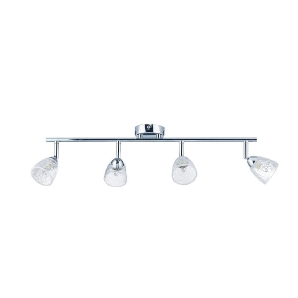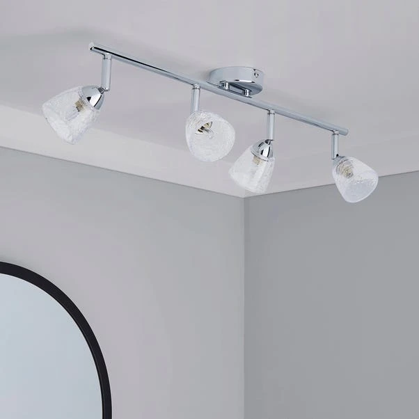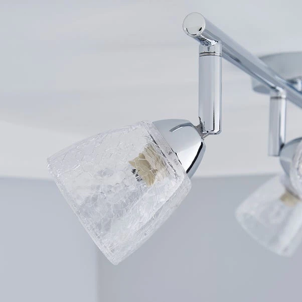 Stylishly crafted with a chrome finished base and adjustable heads, this stunning dimmable spotlight features four lights with decorative crackle glass shades.