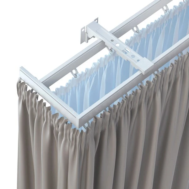 Designed with two fixed curtain tracks so that curtains or voiles can be layered, the Double Layer Aluminium track offers a multifunctional design perfect for any room. Designed for use with medium to heavier weight curtains, this twin track is available in a choice of sizes and can be easily cut to size, making it suitable for any size window. Fixtures, fittings and gliders are included.