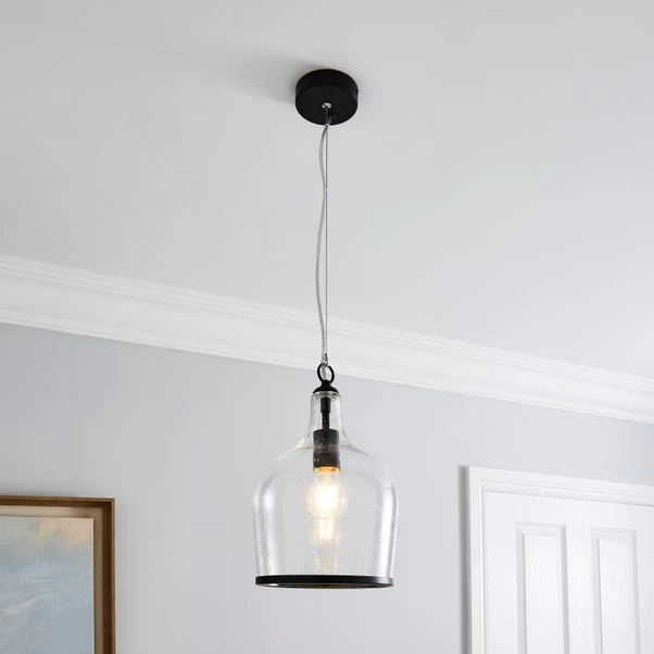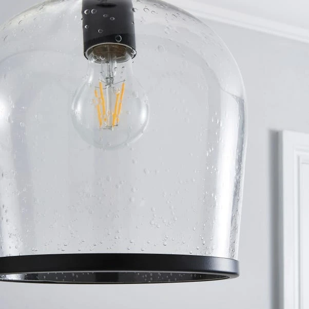 The Lenny Pendant 1 light ceiling fitting is beautifully designed with clear bubbled glass, a modern black trim and black base for a timeless contemporary appearance. This light fitting is height adjustable with a clear flex and black fabric cable, so you can choose your desired length to suit your space. The Lenny is the perfect piece for adding a timeless look to your home with a modern twist. This piece is dimmable compatible, making it both an attractive and practical product. Available in other colourways and matching family items to help coordinate your home.