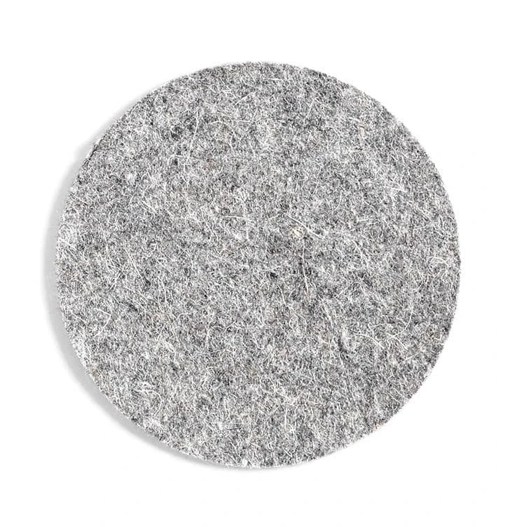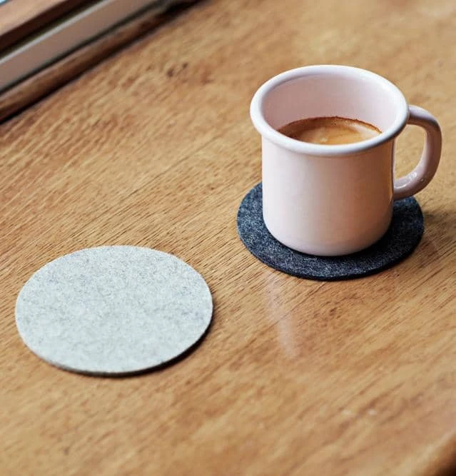 A coaster in felted coloured wool that will protect delicate surfaces from glass marks and spillages.