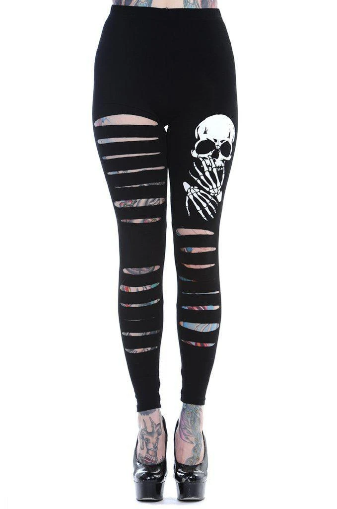 These slashed leggings have a front white skull design, slashed details and a flattering fit.