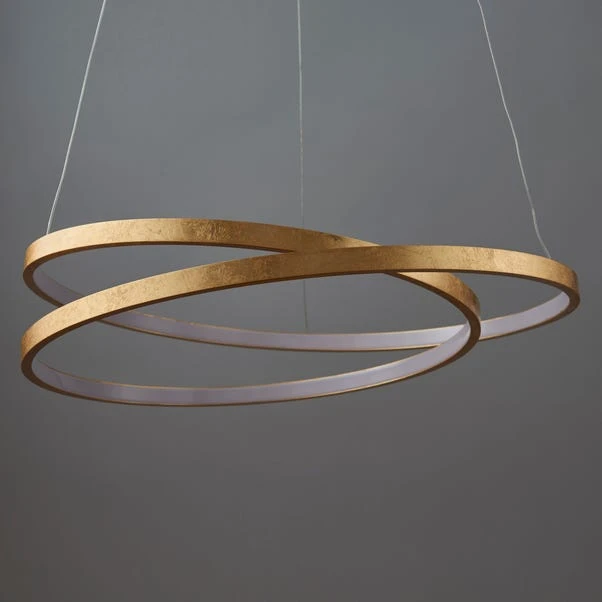 Boasting a contemporary designer style, this ceiling fitting includes an elegant and opulent gold leaf finish, that’s adds the wow factor to any room. This light has 33W integrated LEDs (1650 lumens). This light is warm white 3000k and has an adjustable height.